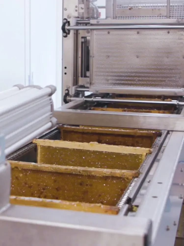 Først skyter vi rammene opp i den automatiske skrellemaskinen med varme, så skal den gjennom honninghøsteren der rammene skal punkteres. Så går alle rammene videre på båndet, etter det kommer den inn i slyngen også stenger man lokket. Etter ca 20 minutter kommer honningen ut.