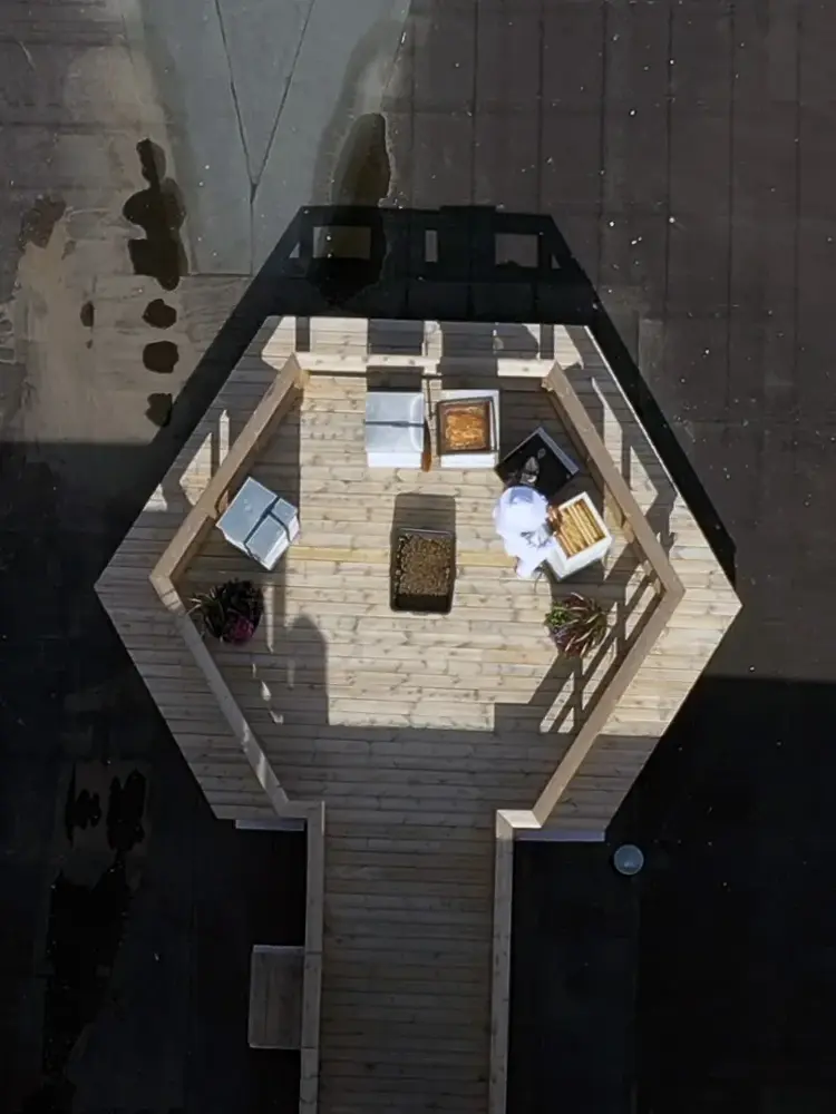 Vi har hatt fire kolonier på taket vårt, alle med hver sin dronning. Disse ble brukt av et tusentalls små bier hver dag om sommeren, og de beveger seg i ca 3 km radius rundt senteret vårt. Biene har forskjellige oppgaver inne i kuben, og når de er ute og flyr, er de kun på jakt etter blomster som kan gi kolonien i kuben pollen og nektar.