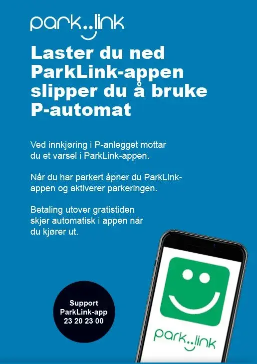 Ved innkjøring i P-anlegget mottar du et varsel i ParkLink-appen. Når du har parkert åpner du ParkLink-appen og aktiverer parkeringen. Betaling utover gratistiden skjerautomatisk i appen når dukjører ut.