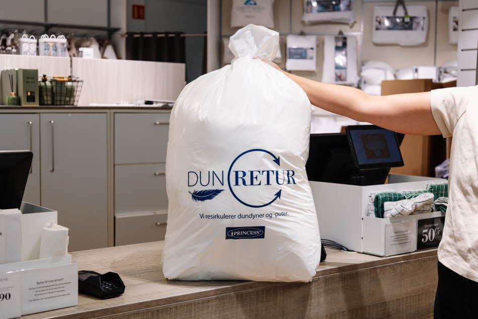 Lurer du på hva du skal gjøre med gamle dundyner og -puter du ikke har bruk for lenger? Hos Princess kan du levere inn både brukte og ødelagte dundyner og -puter uansett om du har kjøpt de hos Princess eller ikke. Dunen blir vasket, sortert og kontrollert, og ren dun brukes på nytt som fyll i for eksempel dundyner eller dunjakker. Trekkene er ofte slitt og kan ikke gjenbrukes som trekk, men med ny teknologi resirkuleres de til isolasjonsmateriale til bygninger. Ved å levere inn brukte dundyner og -puter hos Princess kan gode materialer varme på nye måter.
