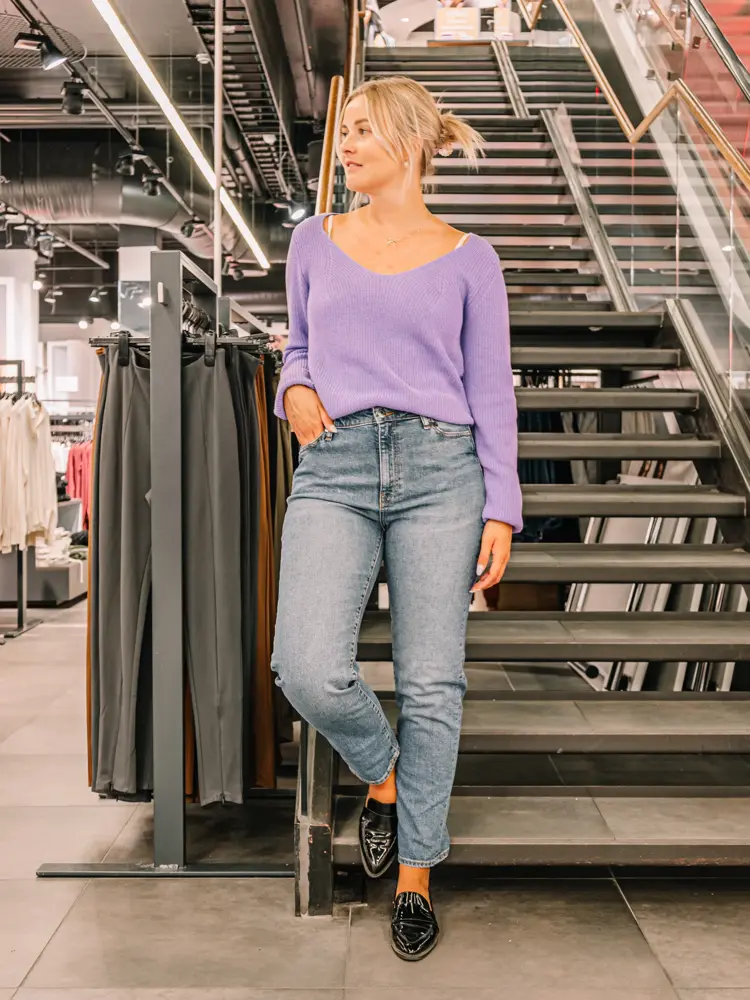 En kombinasjon som er perfekt om høsten er jeans og strikkegenser. Gå for en klassisk stil med en nøytral farge eller gå for en fargerik genser som lilla, grønn eller gul for å sette mer farge på antrekket. Om du vil style antrekket litt opp kan du ha en skjorte under genseren og la skjorten stikke frem under genseren og skjortekragen over. Det passer like godt til hverdags som på kontoret. For en avslappet og komfortabel stil gå for en litt oversized genser. Det er spesielt flatterende med en jeansmodell som er høy i livet og du har genseren litt ned i jeansen for å fremheve midjen.