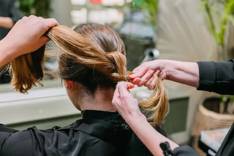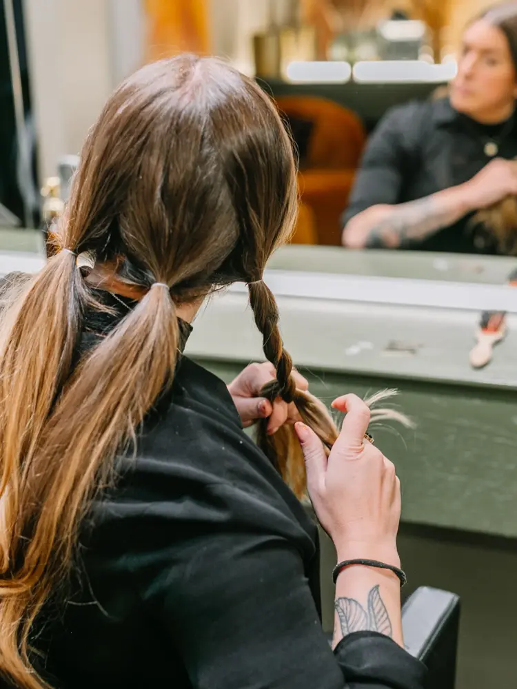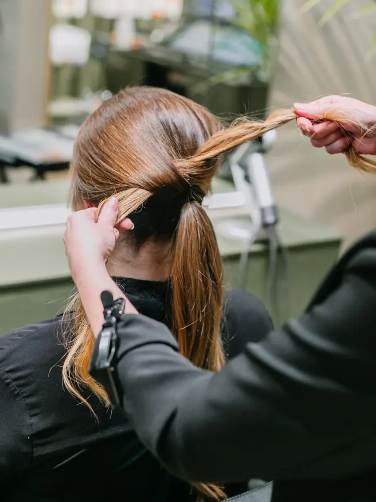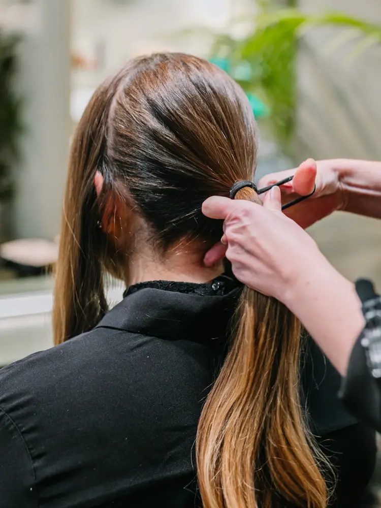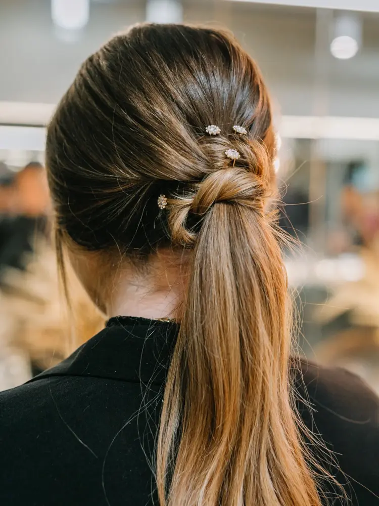 Start med å fordele håret i tre, ta bakre del i en hestehale, og la front og litt av hver side være løs. Knyt de to sidene over hestehalen, og fest med en liten strikk under hestehalen. Gjør det samme en gang til! Bruk noen ekstra lusespenner til å feste hår som stikker ut, og bruk gjerne noen hårnåler med fine detaljer på for å pynte hestehalen. Voila, en enkel, men dekorativ og elegant hestehale!