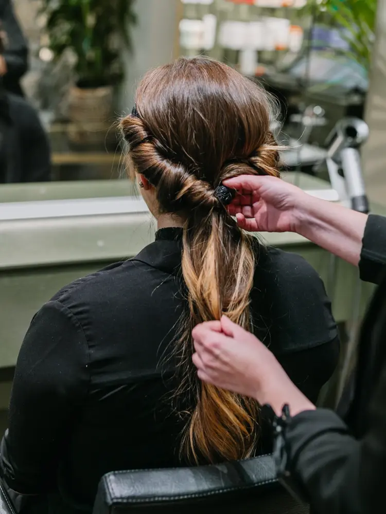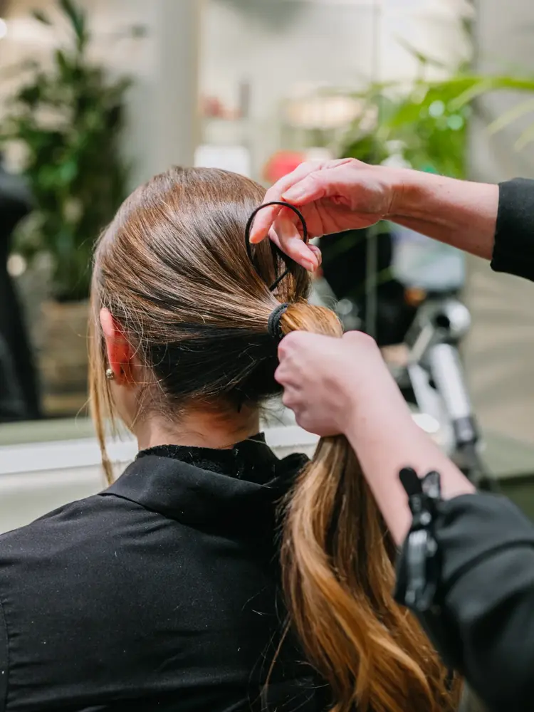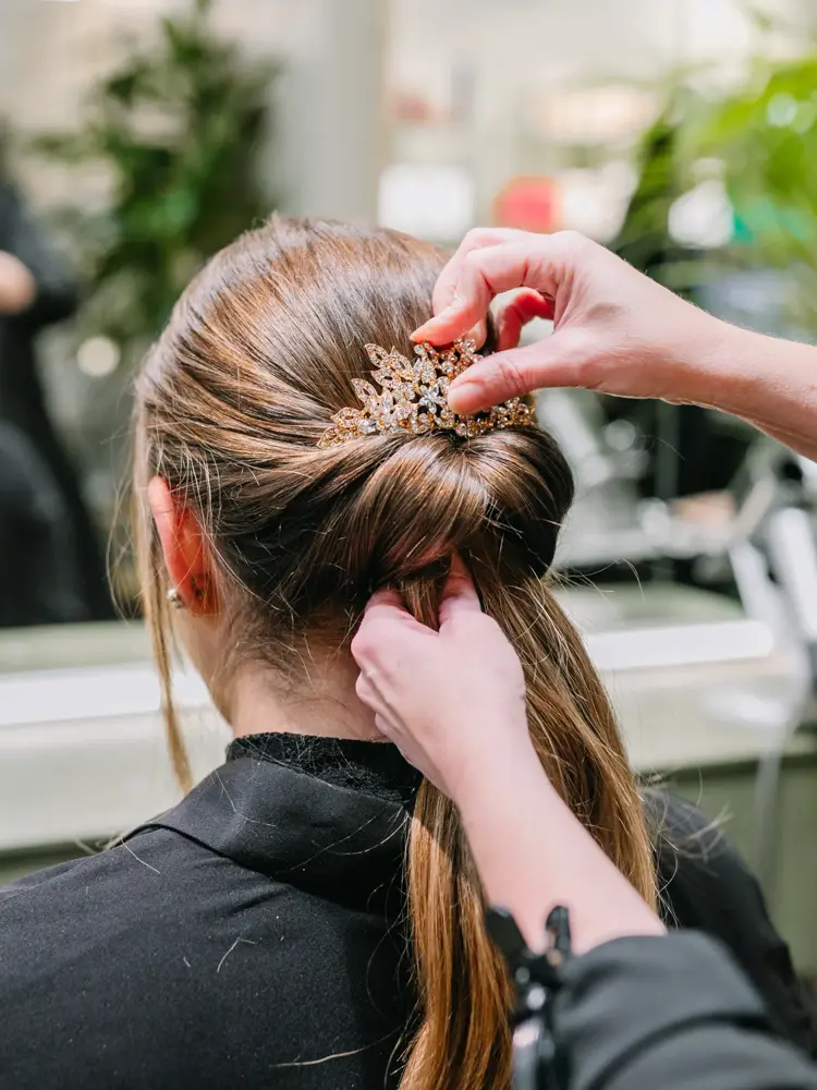 Frisyre nummer to er også basert på en hestehale. Her starter du med alt hår dratt bak i hestehalen. Hos Glitter finner du et verktøy som kalles hårlasso/loop, denne kan du bruke ved å tre den ned i håret bak strikken og dra hestehalen gjennom. Da skjuler du selve hestehalen, og håret blir kjempefint bak. Her er det ekstra dekorativ å adde en hårkam med strass, som vist på bilde. Denne finner du også hos Glitter.