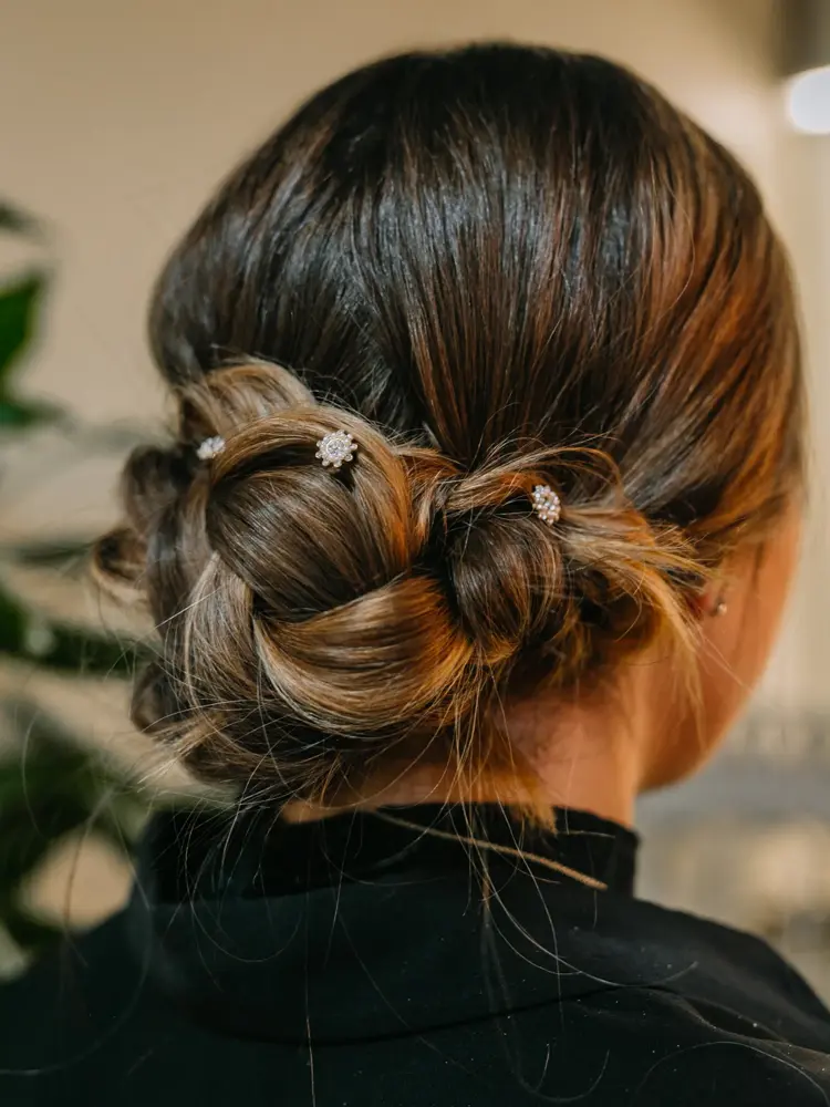 Den kanskje aller enkleste, men fortsatt veldig fine, frisyren er hårnåler med strass på den ene siden. Dra håret bakover, fest ved midten av bakhodet med en liten spenne og bruk deretter strass spennende ved øret. Enkelt, men veldig fint!