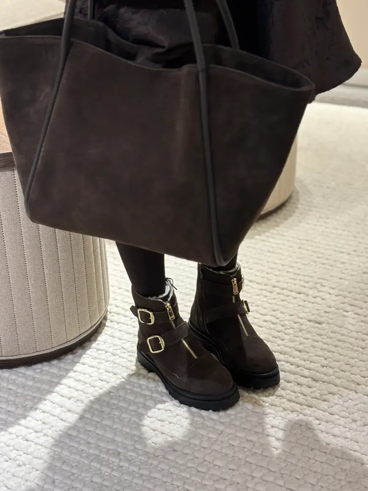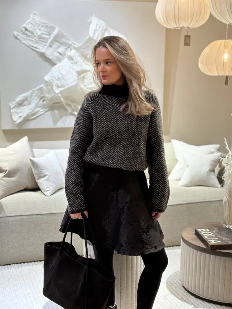Silje har på seg en lekker brun kjole som base for antrekket. På jobb stylet vi kjolen med tykke brune strømper og en genser over slik at bare skjørtet på kjolen blir synlig og en tøff teddy jakke over. Brune lave boots passer utmerket til antrekket.