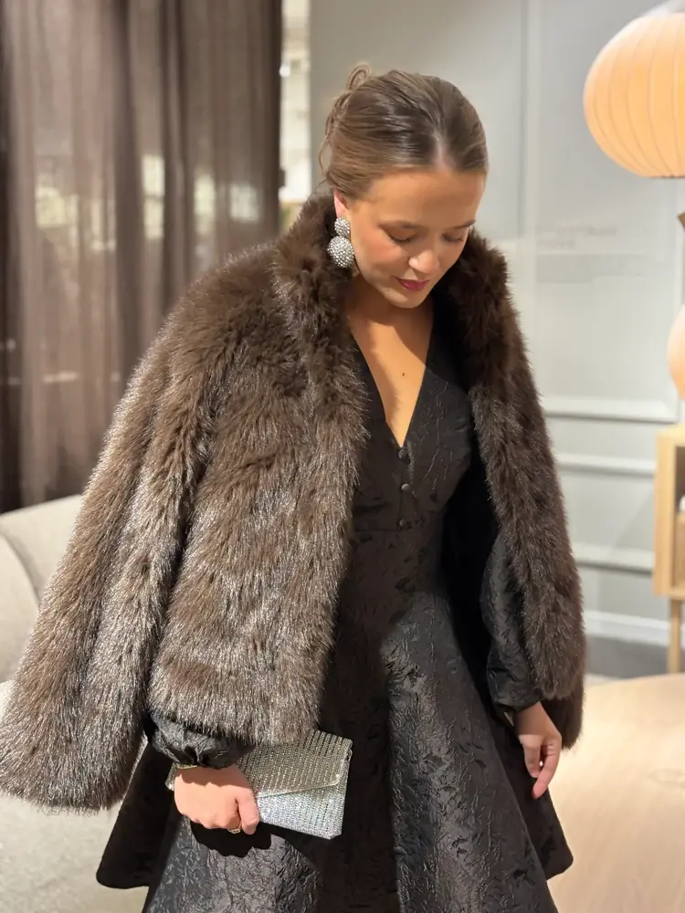Til kveldens julebord ble genseren og jakken byttet ut med en lekker fuskpels jakke, tynne strømper og lekkert glitrende tilbehør som ørepynt, veske og sko. I år skal vi nemlig skinne og glitre!