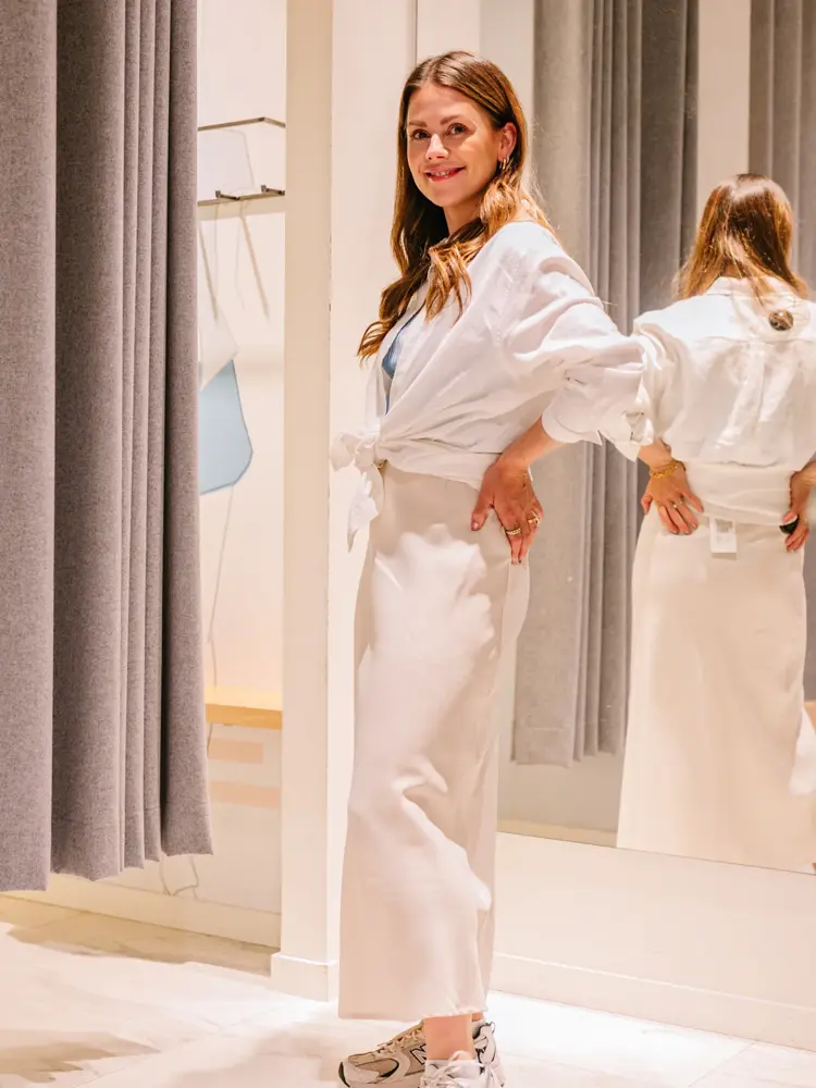 Foruten shorts og kjole så er linskjorten også kjempefin til sommerens skjørt. Enten det er langt eller kort, løst eller tettsittende, mønstret eller ensfarget, så funker skjorten i lin perfekt til. Vi har valgt å style den med et tettsittende slip skjørt, de to ulike materialene mot hverandre er kjempe fint. Knyt gjerne skjorten opp for å lage litt mer silhuett, eller ha den løst hengende over. Man kan også velge å kneppe skjorten opp når man styler den til skjørt, stapp gjerne skjorten ned i skjørtet og puff den litt opp.