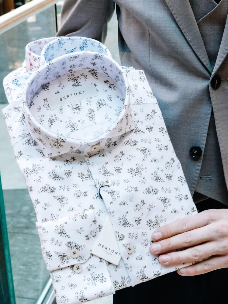 Bertoni tipser også om å velge en mønstrete skjorte istedenfor den klassiske hvite skjorten om du ønsker noe litt annet. De har hvite skjorter med brunt, blått og rødt mønster som er sommerlige og pyntet. Perfekt om kleskoden er litt mer casual.