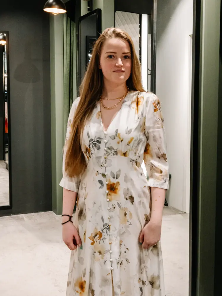Er du ikke helt klar for de sterke fargene så finner du også kjoler med blomsterprint i dusere toner. For eksempel denne fine fra VIC med nydelige blomster i gult og grønt. Kjolen er i lett materiale og med knapper som er en fin detalj.