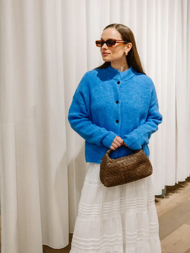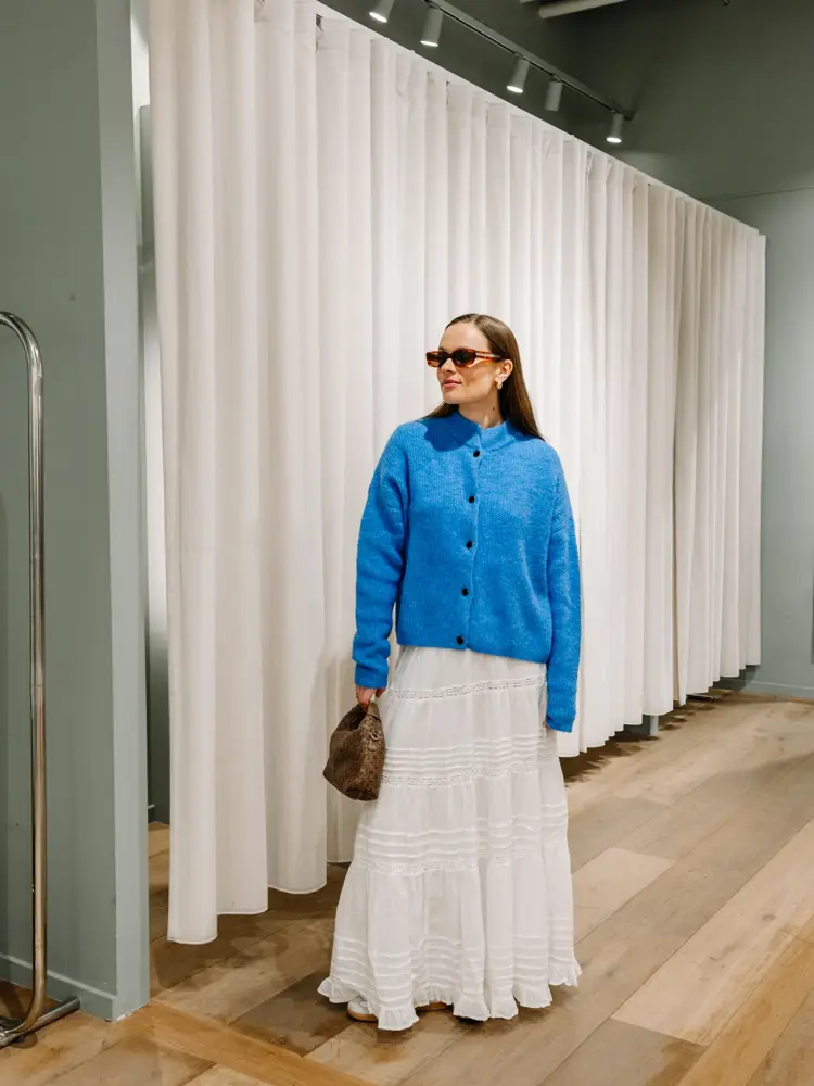 En fin måte å kombinere sommerkjoler eller skjørt på, er å legge til en strikket genser eller cardigan for en avslappet, men stilfull look. Dette gir antrekket en flott balanse mellom komfort og eleganse. For eksempel kan du kombinere et sommerskjørt med en strikket cardigan, som denne i blått fra Message. Cardiganen tilfører en myk og elegant touch, samtidig som du holder deg komfortabel. Dette er en fin måte å tilpasse antrekket til sommerens festligheter, enten du ønsker en mer avslappet stil eller en litt mer pyntet variant.