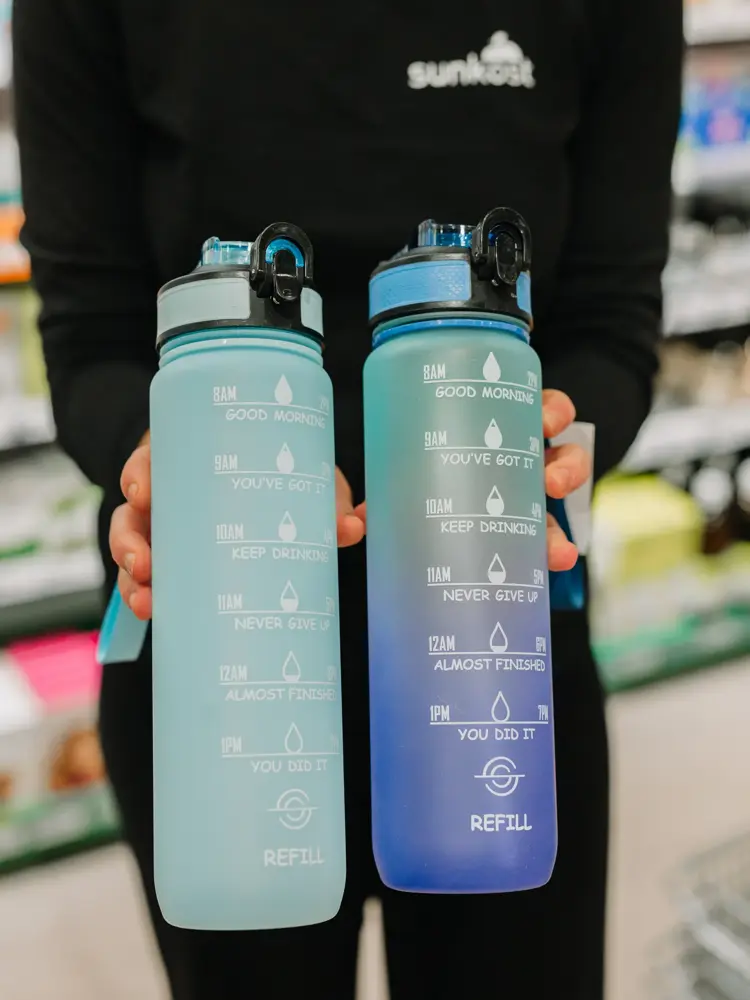 Mengden vann du får i deg i løpet av en dag har mye å si for hvordan du presterer og hvordan kroppen din har det. Anbefalt inntak i løpet av en dag er 2 - 2,5 liter. De populære drikkeflaskene fra Dellia som du finner hos Sunkost hjelper på motivasjonen. Dette er flasken som “minner deg på” å drikke nok vann. Motivasjonsflasken har en tidsmarkør som viser hvor mye vann som bør konsumeres per time, så du lett ser hvor mye vann det er anbefalt å drikke. Om du fyller flasken helt opp rommer den ca 1 liter. Den kommer i flere fine farger, slik at du har en drikkeflaske i en lekker farge.