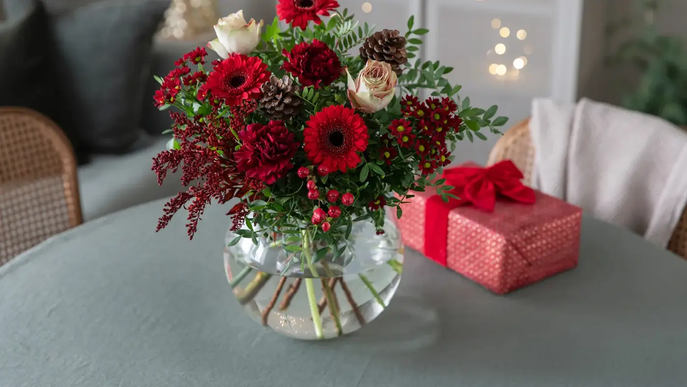 En vakker julebukett er alltid populært, og rødt og hvitt er de mest populære fargene i julen. En bukett er også flott å ta med som en oppmerksomhet til vertskapet hvis du skal på julebesøk. Et lite tips er å levere blomstene på forhånd, så kan de brukes i pyntingen og stå klare på bordet når gjestene kommer.