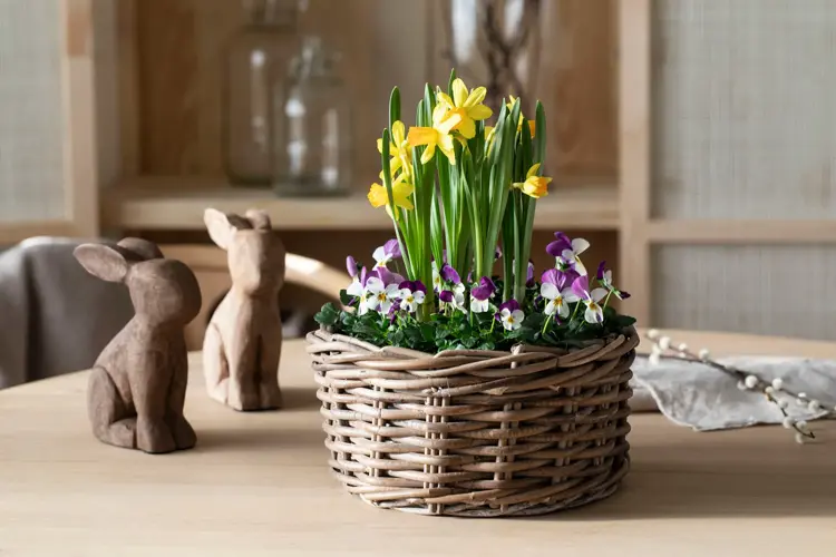 Det er ikke så mye som skal til. Med gule blomster og litt påskepynt så har du skapt en koselig påskestemning, enten du skal være hjemme eller på hytta.