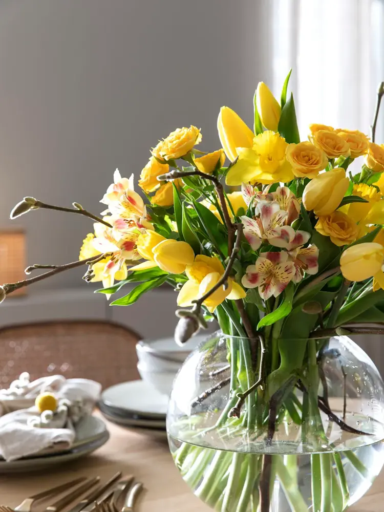 Vakre buketter, gule roser eller gule tulipaner er nydelig pynt på påskebordet. Tulipaner tåler å ligge kaldt og tørt i flere døgn, f.eks. i kjøleskap eller kjeller, så de er supre å ta med på påskeferie. Er de slappe snitt av 1 cm på stilken og sett dem i vann med plasten på i ca. 1 time.