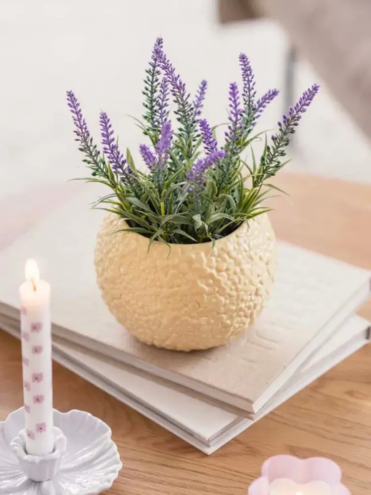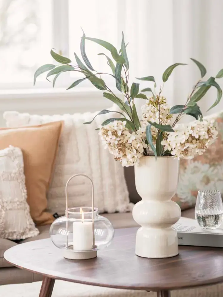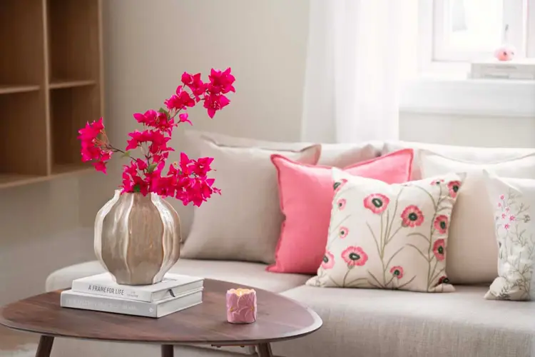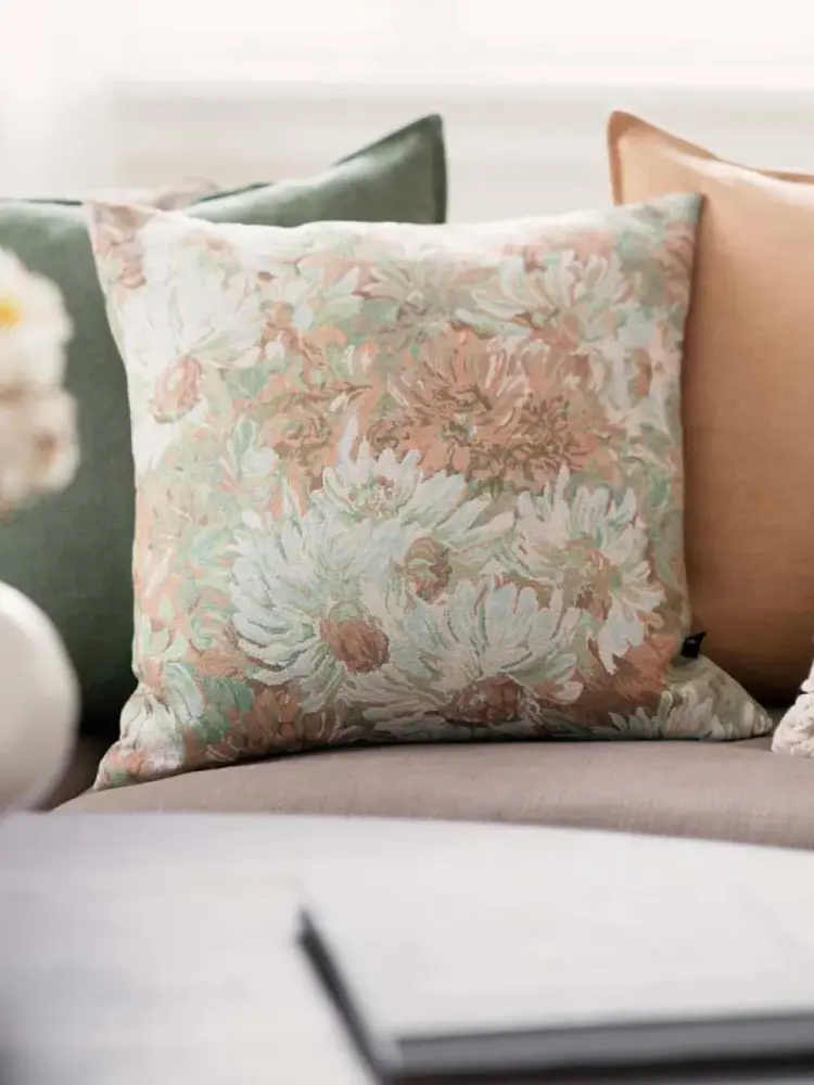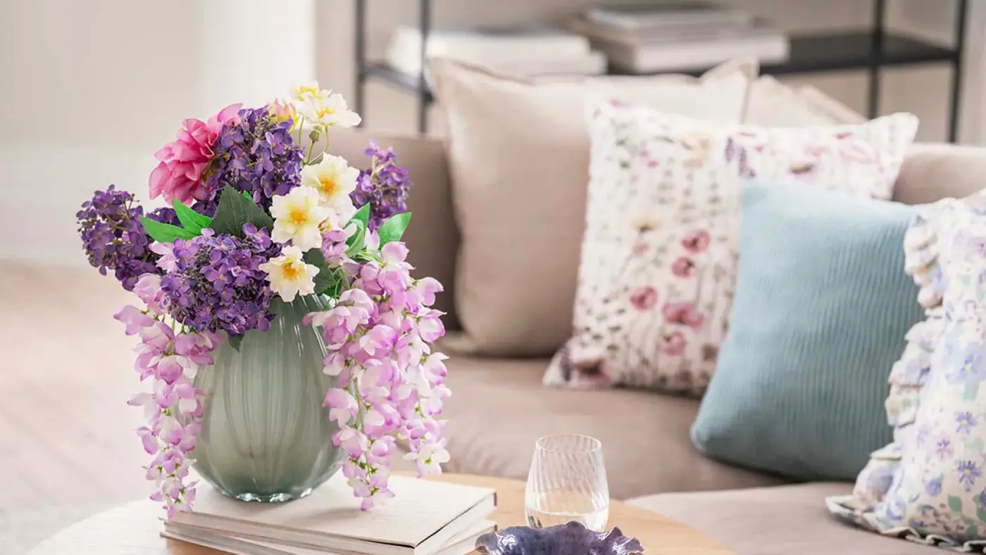 Lekre putetrekk, vaser, stilkblomster og grønne planter.