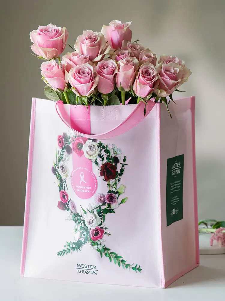 Hos Mester Grønn får du i oktober kjøpt en fargerik Rosa sløyfe-bukett som både sprer glede og bidrar til den viktige brystkreftforskningen. Du får også kjøpt roser, epledrikk, sjokolade, snittekniv og handlenett, der en del av salgsbeløpet går til aksjonen. I tillegg selger Mester Grønn Kreftforeningens Rosa sløyfe som i år er laget av designeren Fam Irvoll.